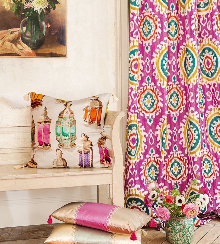 Manuel Canovas Daya Fuchsia ikat mintás textil. Manuel Canovas a látványos minták és élénk színek mestere, számos lakástextil és tapéta kollekció megálmodója. A kezdetek óta mindegyik kollekciója hatalmas sikert arat. Jellemző színeinek és egzotikus mintáinak köszönhetően a stílusa utánozhatatlan és azonnal felismerhető. Manuel Canovas a neves angol Colefax & Fowler gyártóval működik együtt, aki világszerte forgalmazza a szöveteit és a tapétait.