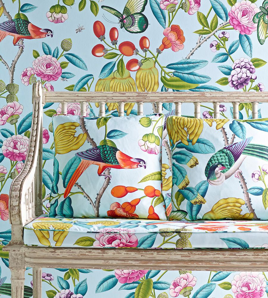 Manuel Canovas Serendip Nuit madár mintás textil. Manuel Canovas a látványos minták és élénk színek mestere, számos lakástextil és tapéta kollekció megálmodója. A kezdetek óta mindegyik kollekciója hatalmas sikert arat. Jellemző színeinek és egzotikus mintáinak köszönhetően a stílusa utánozhatatlan és azonnal felismerhető. Manuel Canovas a neves angol Colefax & Fowler gyártóval működik együtt, aki világszerte forgalmazza a szöveteit és a tapétait.