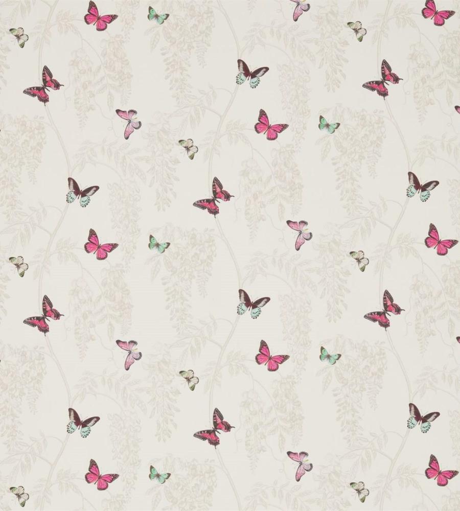 Sanderson Wisteria & Butterfly Fuchsia/Parchment pillangó mintás textil. A Sanderson Woodland Walk textil kollekció aprólékosan kidolgozott és kézzel festett mintákból áll össze, melyeket az erdei kirándulások ihletettek. Ebben a kollekcióban gyönyörű virág, levél és erdő mintás textileket és hímzett szöveteket találhatunk számos árnyalatban. A Woodland Walk kollekció különlegessége a gyönyörű madár mintás Woodland Chorus textil. A Sanderson a textilekhez illő tapétákat is ajánl. Az anyagok alkalmazhatóak sötétítő és dekor függöny varrásra, takaró és díszpárna készítésre, valamint bútorkárpitozásra. A gazdag történelemmel rendelkező Sanderson a világ egyik legnevesebb textil és tapéta gyártója, amely rendelkezik az angol királyi udvar hivatalos beszállítója címmel. Leginkább a nyomott mintás tapétáiról és textiljeiről híres, de kínálatában prémium minőségű szőnyegek és lakás kiegészítők is találhatóak.