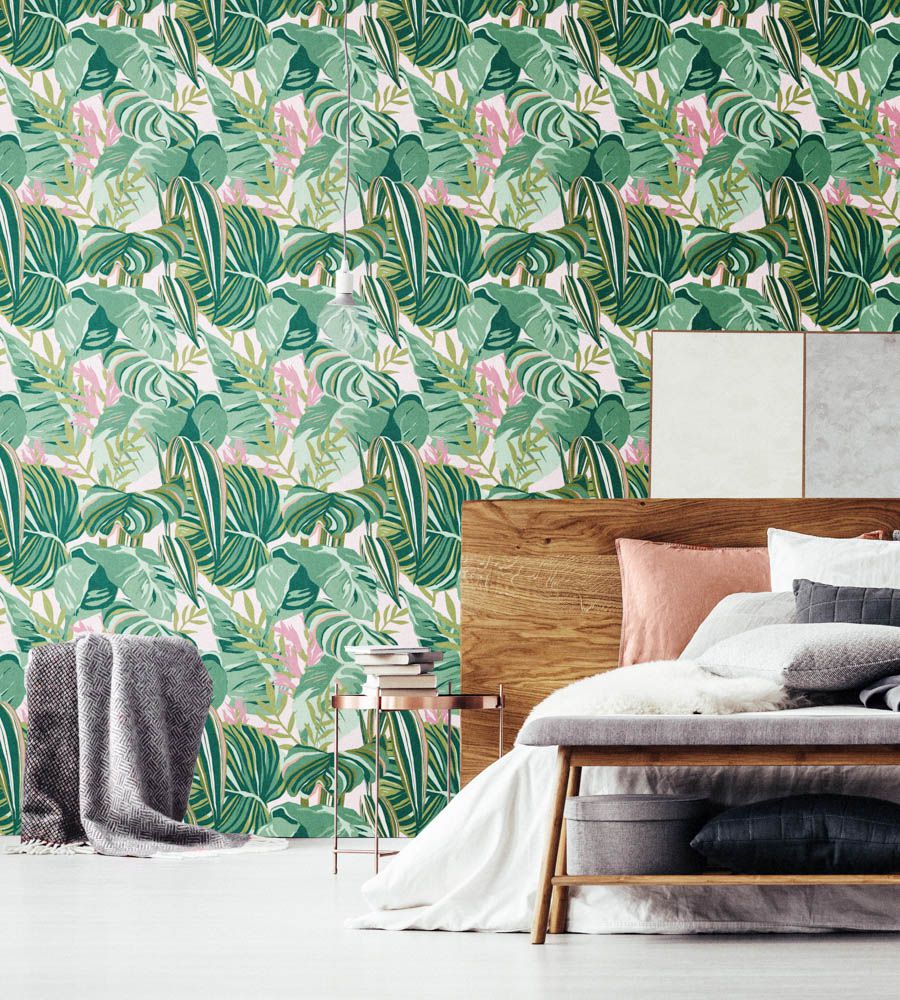 Mind The Gap Tropical Foliage Green, Pink level mintás tapéta.